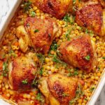 This flavorful Baked Tomato Chicken Thighs with Couscous recipe combines succulent chicken thighs roasted with vibrant vegetables and aromatic spices, served over pearl couscous infused with lemon and tarragon. A perfect one-dish meal celebrating Middle Eastern and Mediterranean flavors, delivering a comforting and balanced dinner.