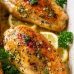 - Final Touch and Serve: After baking, spoon some of the sauce from the bottom of the baking dish over the chicken. Sprinkle chopped parsley over the top and garnish with lemon slices if desired. Serve warm.