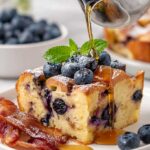 - Soak the casserole: Slowly pour the egg custard mixture evenly over the layered bread and blueberries in the baking dish. Cover the pan tightly with foil and refrigerate for at least 4 hours or up to overnight (12 hours) to allow the bread to soak up the custard.