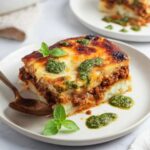 A comforting Cheesy Bolognese Rice Bake that combines savory ground beef bolognese with seasoned rice and a creamy cheesy béchamel sauce, baked to a golden perfection. This family-friendly dish offers all the flavors of classic lasagna with a unique twist, perfect for an easy weeknight dinner or make-ahead meal. It’s gluten-free adaptable and topped with fresh basil and pesto for an aromatic finish.