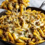 This Cheesy Ground Beef Pasta Skillet is a delicious and hearty one-pan meal featuring tender ground beef simmered in a flavorful tomato sauce with garlic, onions, and parsley, then tossed with al dente ziti pasta and melted mozzarella cheese. Perfect for a quick weeknight dinner, it combines savory, cheesy goodness with a subtle kick from red chili flakes.