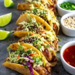 - Assemble Tacos: Spoon the cooked chicken into the crispy wonton shells. Top with the prepared coleslaw. Drizzle with sweet chili sauce and garnish with chopped cilantro and sesame seeds. Serve immediately and enjoy!