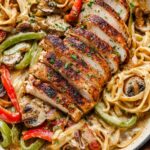 For special occasions, I like to serve the pasta in shallow bowls with the sliced chicken fanned out on top, garnished with colorful bell pepper strips and a sprinkle of smoked paprika. It instantly elevates the look and makes the meal feel festive.