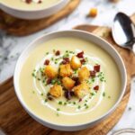 - Add toppings and serve: Ladle the soup into bowls and garnish with a drizzle of cream, crispy pancetta or bacon, croutons, and finely diced fresh chives. Enjoy warm.