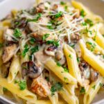 - Garnish and Serve: Garnish the dish with chopped fresh parsley and extra parmesan cheese if desired. Serve warm and enjoy your creamy mushroom chicken pasta!
