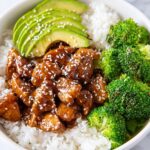 Delicious Teriyaki Chicken and Rice Bowls featuring tender boneless chicken breast simmered in a homemade teriyaki sauce, served with crisp-tender steamed broccoli, creamy avocado slices, and sprinkled with sesame seeds. This easy and satisfying dish is perfect for a quick weeknight meal.