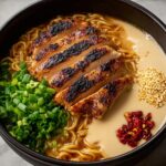 Spice up dinner with fiery chicken ramen featuring tender chicken breasts simmered in a velvety, creamy garlic broth with a bold chili kick. This comforting and savory dish combines the rich flavors of garlic, paprika, and chili sauce with classic ramen noodles, garnished with green onions and sesame seeds for an irresistible meal perfect for any occasion.