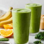 A refreshing and nutritious Super Green Smoothie packed with fresh spinach, bananas, blueberries, peanut butter, flaxseeds, and skim milk for a delicious energy boost.