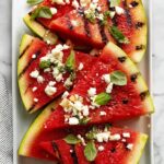 - Assemble and Serve: Arrange the grilled watermelon slices on a serving platter. Sprinkle crumbled feta over the top and garnish with torn basil leaves. Serve immediately.