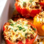 This Ground Turkey Stuffed Peppers recipe is a flavorful and healthy dish featuring oven-roasted bell peppers filled with a savory mixture of ground turkey, vegetables, and melted cheddar cheese. Perfect for a low-carb, hearty dinner ready in just 30 minutes.