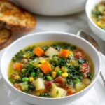 This hot and comforting vegetable soup is a cozy bowl filled with healthy, vibrant vegetables simmered in a rich broth with aromatic herbs and a hint of lemon.