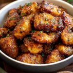Hot Honey Salmon Bites are bite-sized pieces of salmon seasoned with paprika, garlic, and onion powders, air-fried to perfection, and coated with a sweet and spicy hot honey butter glaze. They make a flavorful appetizer or main course and are garnished with fresh parsley for a vibrant finish.