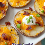 Loaded Baked Potato Rounds are crispy, bite-sized slices of russet potatoes topped with melted cheddar cheese, crispy bacon, sour cream, and green onions. Perfect for game day snacks or a tasty appetizer, these delicious rounds combine savory flavors with a satisfying texture.