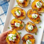 Loaded Baked Potato Rounds are crispy, bite-sized slices of russet potatoes topped with melted cheddar cheese, crispy bacon, sour cream, and green onions. Perfect for game day snacks or a tasty appetizer, these delicious rounds combine savory flavors with a satisfying texture.