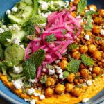 - Assemble the Bowls: In shallow bowls, spread a big scoop of the feta sauce on one side. Add a ½ cup scoop of cooked rice next to it. Top a portion of the feta sauce with ¼ cup roasted chickpeas. Add a scoop of the spiced ground chicken on the rice side. Top with sliced cucumbers and pickled red onion.