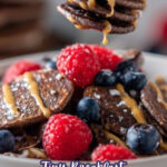 Start by adding everything for the pancake batter—gluten-free rolled oats, a ripe banana, vanilla extract, baking powder, cinnamon, unsweetened cacao powder, protein powder, eggs, and milk—into a high-speed blender. Pulse gently until the batter is smooth but still light. Avoid over-blending so your mini pancakes stay fluffy, not dense.