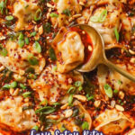 - Add Toppings and Serve: Drizzle chili oil over the dumplings, then scatter with crushed peanuts, scallions, cilantro, crispy onions, and sesame seeds. Serve immediately with lime wedges for squeezing over the top.