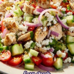 This 30-minute Greek-inspired dinner features grilled chicken marinated in a lemony, garlicky vinaigrette, combined with fresh chopped vegetables and salty feta cheese. Perfect for summer, this vibrant and healthy salad is quick to prepare and can be served with grilled pita bread for a complete meal.