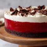 - Decorate Cheesecake: Spread or pipe the whipped cream topping evenly over the set cheesecake. Garnish with additional shaved or grated dark chocolate if desired.