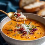 A comforting and flavorful roasted vegetable soup made with sweet potatoes, bell peppers, carrots, and garlic, enhanced with aromatic spices and finished with creamy parmesan cheese and fresh thyme.