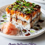 - Garnish and serve: Sprinkle the top of each piece with furikake rice seasoning, drizzle with eel sauce, and sprinkle with chopped green onions. Add optional fresh garnishes such as thin cucumber, radish, jalapeño, avocado slices, or pickled ginger for added texture and flavor.