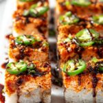 - Garnish and serve: Sprinkle the top of each piece with furikake rice seasoning, drizzle with eel sauce, and sprinkle with chopped green onions. Add optional fresh garnishes such as thin cucumber, radish, jalapeño, avocado slices, or pickled ginger for added texture and flavor.