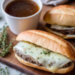 Slow Cooker French Dip Sandwiches with Au Jus offer a tender, flavorful roast beef experience made easy with a slow cooker. Juicy beef chuck roast cooked with onions, thyme, and bay leaf is served on toasted French rolls with horseradish mayo, melted provolone, and a savory beef broth for dipping.