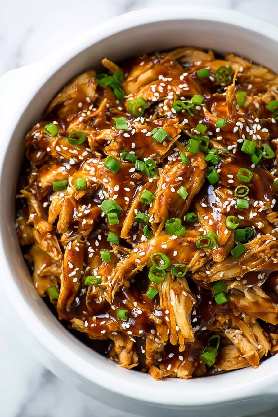 After you toss the shredded chicken with the thickened teriyaki sauce, sprinkle it generously with toasted sesame seeds and freshly sliced green onions. If you like, add a handful of chopped cilantro or a few thinly sliced red chili peppers for a fresh, colorful pop and a bit of heat.