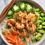 - Assemble bowls: Start with a base of warm cooked rice. Add cucumber, jalapeño, shredded carrots, steamed edamame, then top with the saucy shrimp.