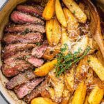 - Rewarm Potatoes and Serve: While the steaks rest, add the potatoes back to the skillet to gently reheat. After resting, slice the steaks against the grain and add them back into the skillet with the potatoes. Optionally, sprinkle with freshly grated Parmesan cheese before serving immediately.