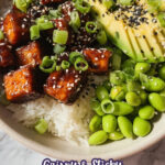- Assemble Bowls: Divide the cooked rice into bowls, add the sticky tofu on top, followed by steamed edamame and sliced avocado. Garnish with spring onions and sesame seeds, then drizzle plenty of the reserved sticky sauce over the bowl. Serve immediately and enjoy!