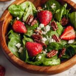 A vibrant and delicious strawberry spinach salad featuring fresh baby spinach, juicy strawberries, crunchy candied nuts, and salty feta cheese, all tossed together and served with a zesty lemon poppy seed dressing. Perfect as a refreshing side or light main course, this salad combines sweet, savory, and tangy flavors with a delightful crunch.