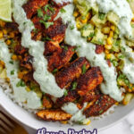 - Assemble Bowls: To assemble, place 1 cup of cooked rice into each bowl. Top with ⅔ cup of street corn salad, add a scoop of the cooked blackened chicken, drizzle with creamy jalapeno sauce, then top with diced avocado and a lime wedge. Sprinkle with tajin seasoning if desired.