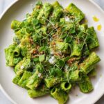 A quick and comforting 15-minute super green rigatoni recipe featuring a creamy spinach and parmesan sauce, topped with crispy breadcrumbs and a drizzle of chili oil. Perfect for a nutritious weeknight meal that’s both easy and delicious.