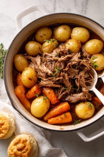 The roast is done when it’s tender enough to pull apart easily with a fork. This typically takes 2 ½ to 3 hours at 325°F in the oven but check periodically if needed.